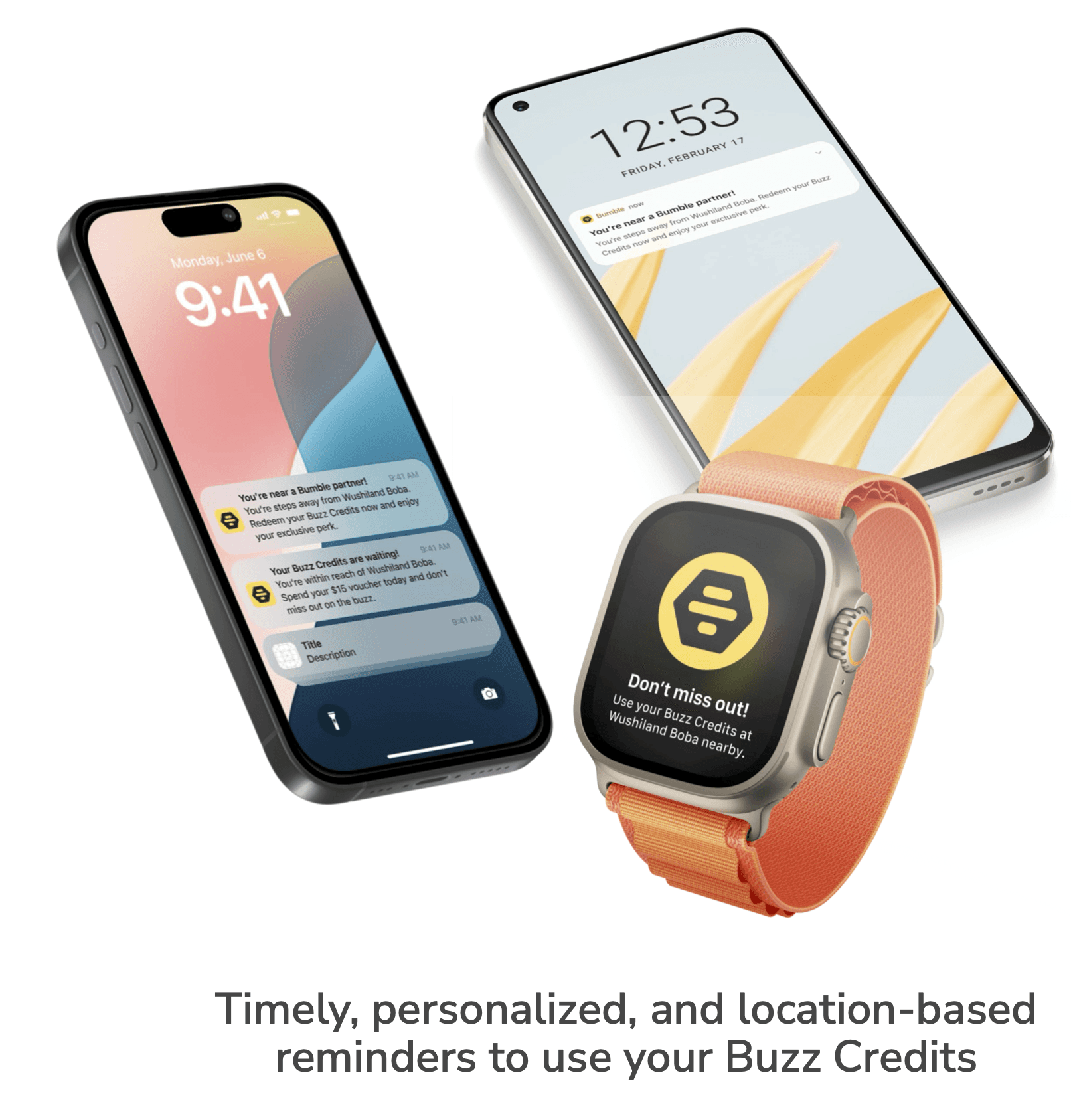 Personalized, proximity-based pings alert users when they are steps away from a partner business (e.g., "Don't miss out! Use your Buzz Credits at Wushiland Boba nearby").