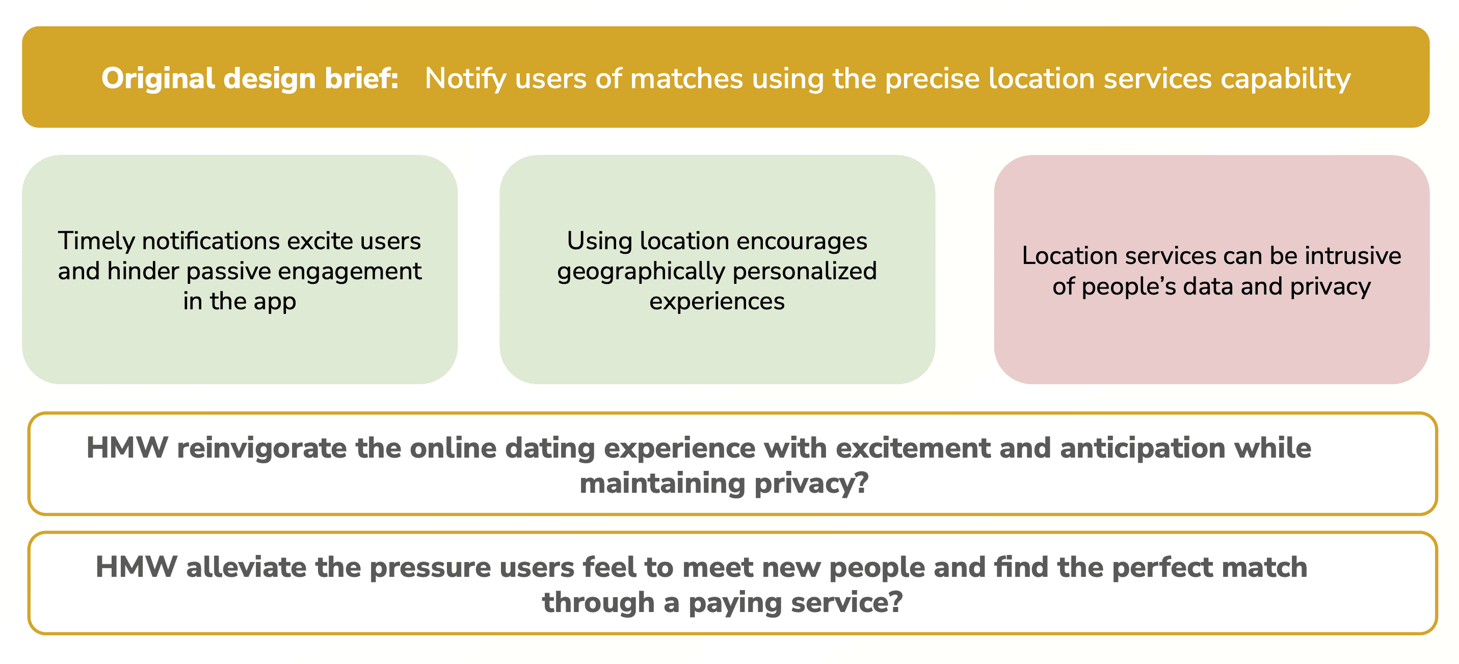 I pivoted the goal to: "How might we reinvigorate the dating experience with excitement and anticipation while maintaining privacy and alleviating the pressure to find a 'perfect' match?"